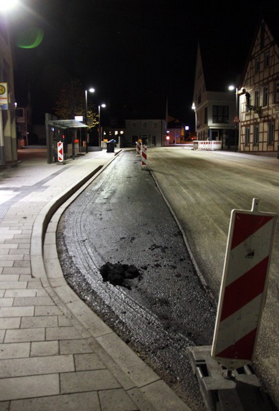 zum Höhersetzen der Schachtdeckel erfolgt. Jetzt kommt es auf das Wetter an, damit der Asphalt dann wirklich verlegt werden kann. Frost wird es nicht geben, es ist aber etwas Regen vorhergesagt.