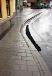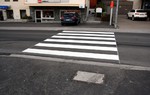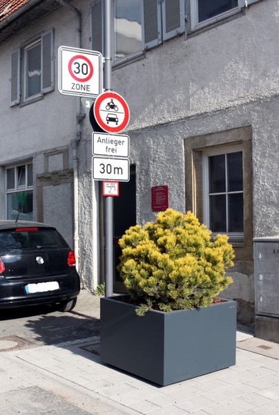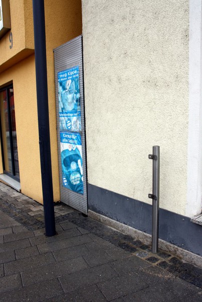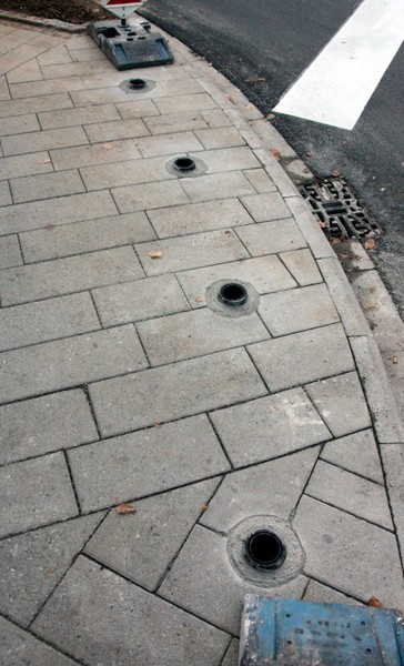 vorwiegend Gehwege vor einem Befahren oder Beparken zu schützen. Dass die Säulen nachträglich ins fertige Pflaster gesetzt wurden, sieht man ihnen etwas an. Die Fahrbahnmarkierungen, Zebrastreifen
