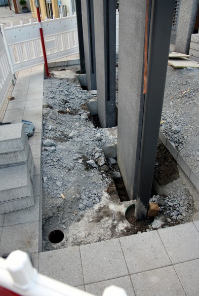 Ebenso gingen in dieser Woche die Arbeiten an Gehwegen und am Vaux-le-Pénil-Platz weiter. Hier wurde das Fundament für ein Buswartehäuschen betoniert. Gegenüber dem