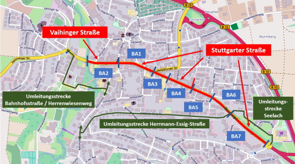 | Bauabschnitt 1 | "Zentrum" Bahnhofstraße bis Ludwigsburger Straße inklusive des Vaux-le-Pénil-Platzes | 07/2017 – 01/2018 26 Wochen |