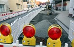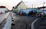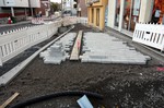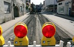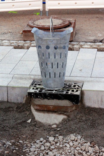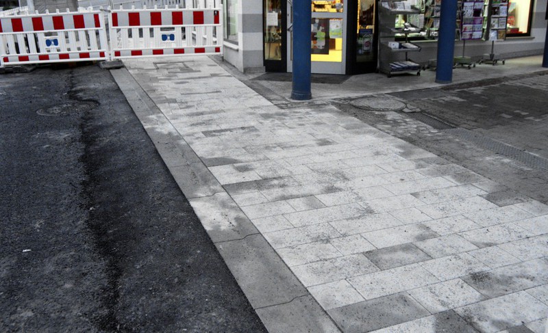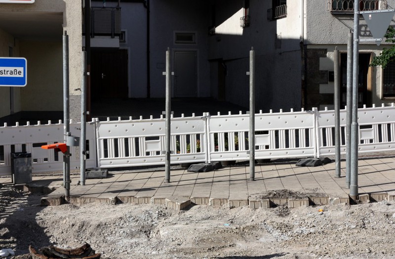 Straße. Hier stehen ja bereits auf der anderen Straßenseite auf dem frisch gepflasterten Gehweg noch Ersatzlaternen. Erzeugt das nicht einen Mehraufwand, wenn man nochmals an den Gehweg ranmuss, um