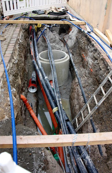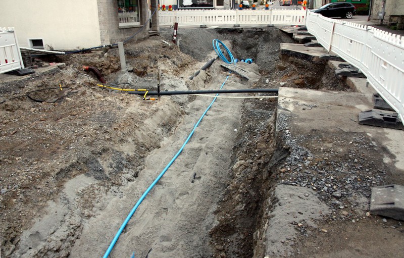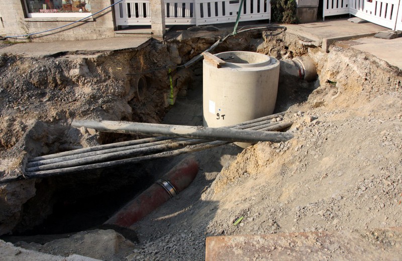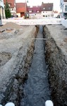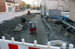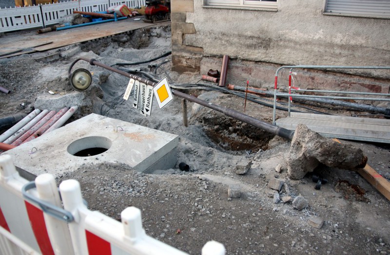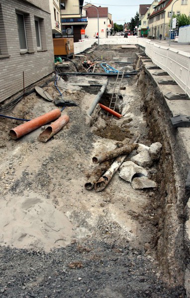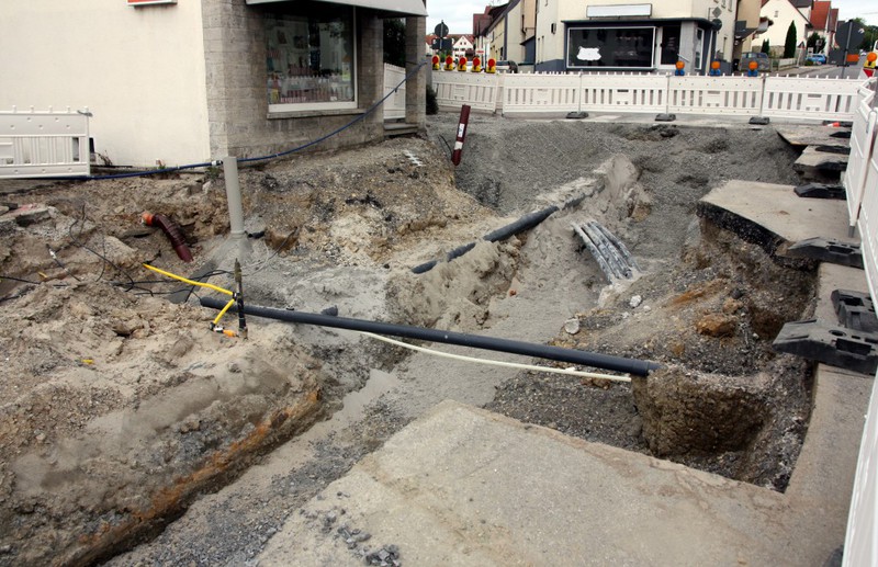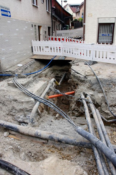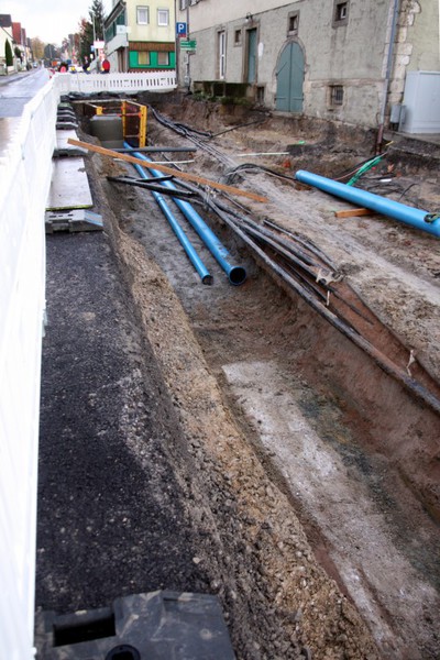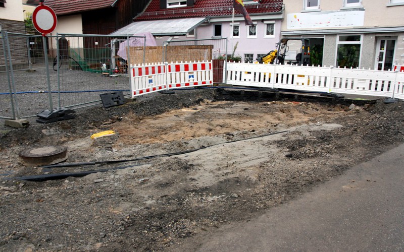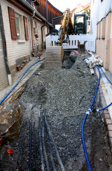 offensichtliche Anzeichen für die Baustelle ist der zwischenzeitlich weitläufig ausgehobene Graben – so stellt man sich die Baustelle vor. Hier wurden auch weitere neue Hausanschlüsse fürs Abwasser