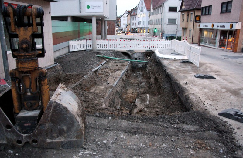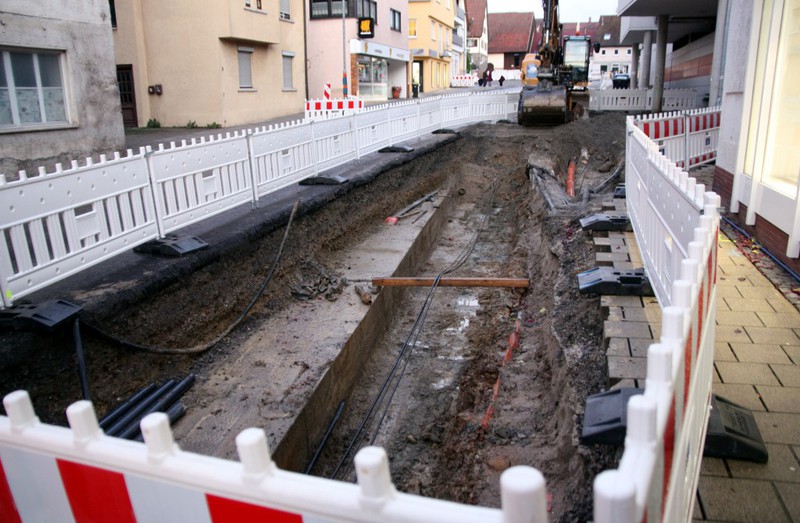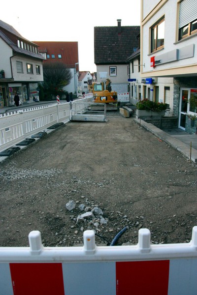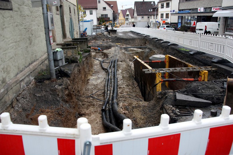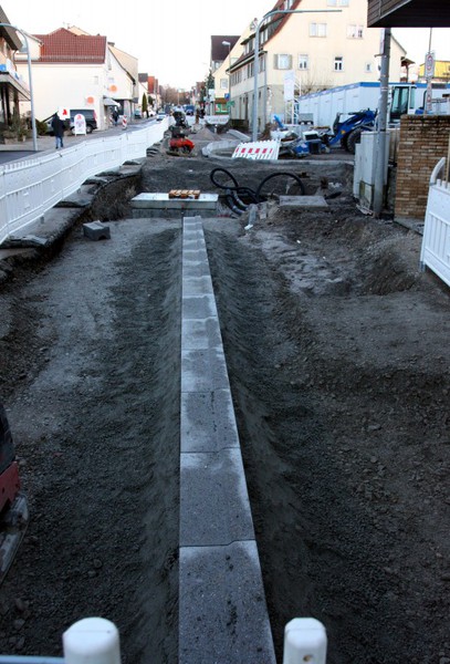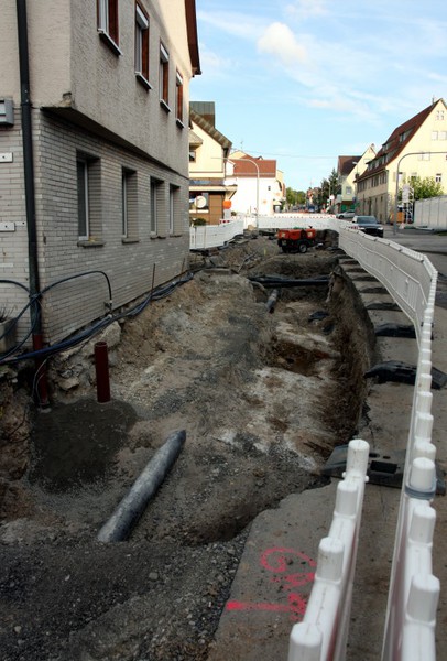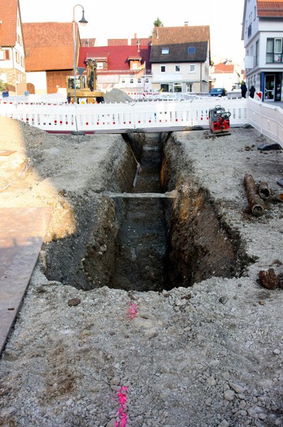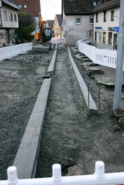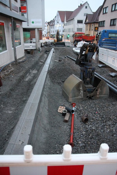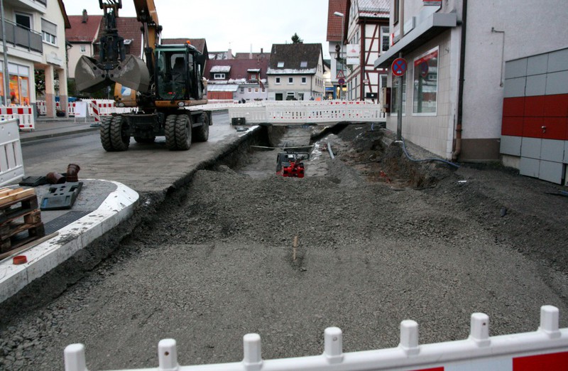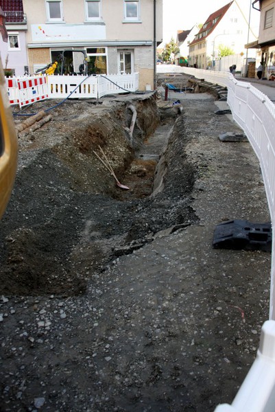 Der Graben für die neue Wasserleitung auf der Südseite der Stuttgarter Straße kommt zügig voran. Es könnte sein, dass bereits in der nächsten Woche ein Zusammentreffen der von zwei Seiten vorgetriebenen Gräben stattfindet. Am nächsten Freitag ist der 1. Dezember und damit der Beginn des Weihnachtsgeschäfts. Es ist jetzt schon abzusehen, dass der Graben bis dort hin nicht zu ist und auch kein neuer Gehweg verlegt ist. Also an der Baufirma liegt es nicht, die machen was sie können. Es liegt wohl am Zeitplan, der eben nicht in der Zeit ist, zumindest wenn man die Versprechungen bzgl. des Weihnachtsgeschäfts ernst genommen hatte.