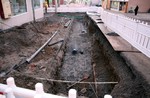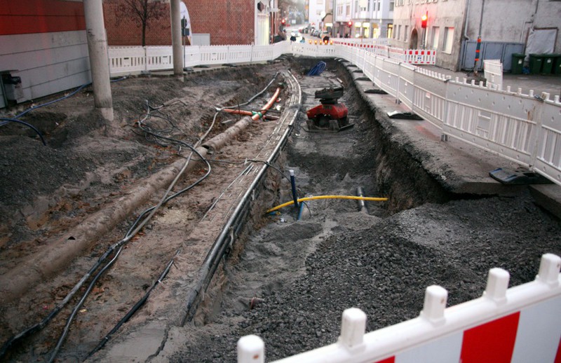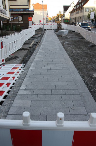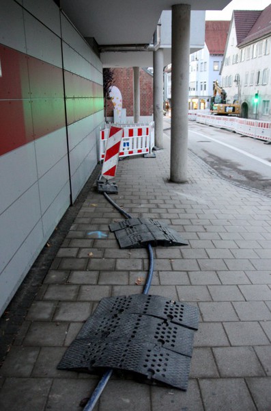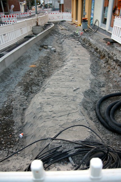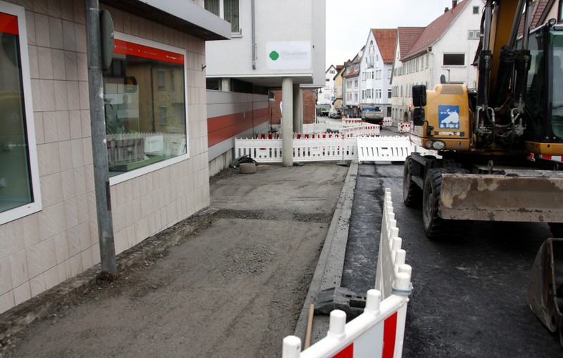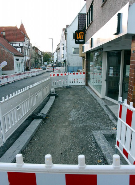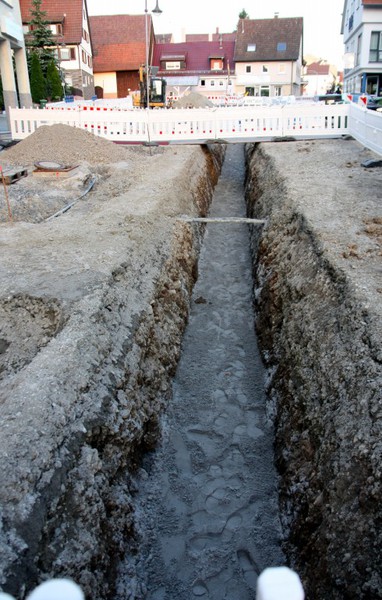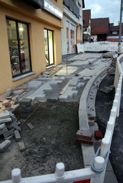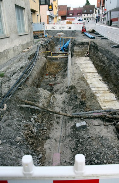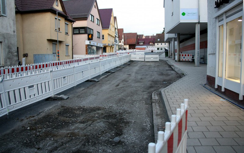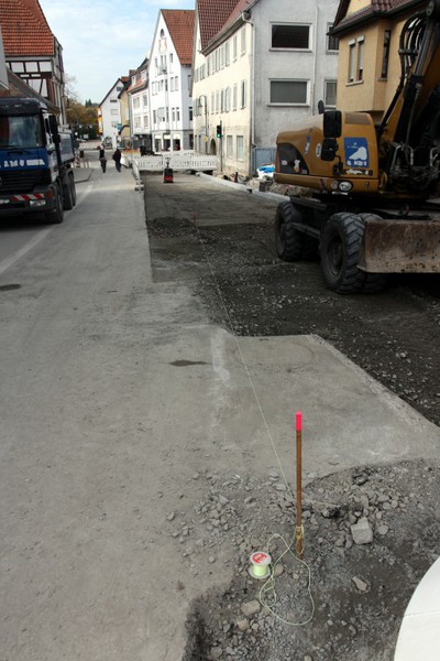 Der Graben für die neue Wasserleitung auf der Südseite der Stuttgarter Straße kommt zügig voran. Es könnte sein, dass bereits in der nächsten Woche ein Zusammentreffen der von zwei Seiten vorgetriebenen Gräben stattfindet. Am nächsten Freitag ist der 1. Dezember und damit der Beginn des Weihnachtsgeschäfts. Es ist jetzt schon abzusehen, dass der Graben bis dort hin nicht zu ist und auch kein neuer Gehweg verlegt ist. Also an der Baufirma liegt es nicht, die machen was sie können. Es liegt wohl am Zeitplan, der eben nicht in der Zeit ist, zumindest wenn man die Versprechungen bzgl. des Weihnachtsgeschäfts ernst genommen hatte.