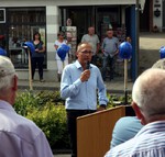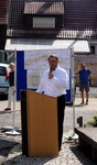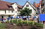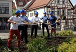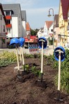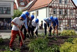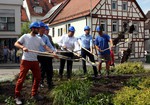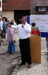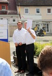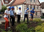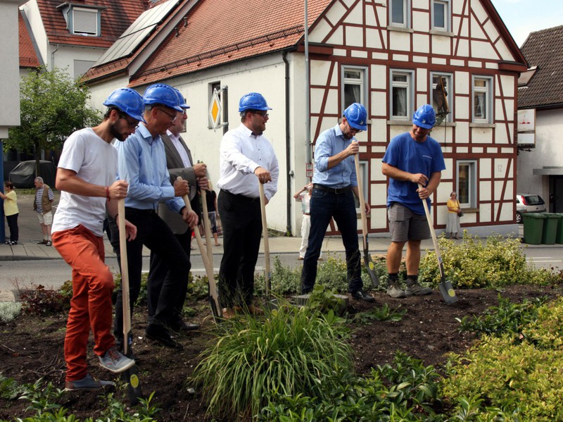 Pünktlich ab 11 Uhr wurde der Spatenstich zur Sanierung der Schwieberdinger Ortsdurchfahrt auf dem Vaux-le-Pénil-Platz vollzogen. Als Redner traten Bürgermeister Lauxmann und Herr Rauschmaier vom beauftragten Planungsbüro auf. Neben Dank für die Beauftragung der Sanierung der Ortsdurchfahrt gab es auch Dank für die bisher erbrachten Planungsleistungen. Zudem warb er intensiv für die ortslokalen Geschäfte, die während der Bauphase alle erreichbar sind. Jeder Einkauf ab 5 € ergibt einen Stempel im "Schwieberdinger Bauplan". Mit 15 Stempeln kann man dann bei ca. alle 6 Wochen stattfindenden Verlosungen von Gutscheinen in einem Gesamtwert von über 2.000 € teilnehmen. Die Treue zu den Schwieberdinger Geschäften lohnt sich also auch während den Bauarbeiten.