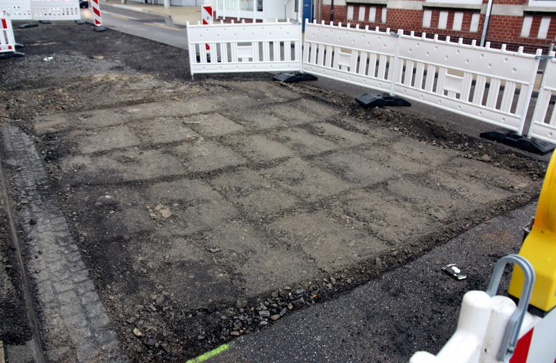 immer wieder zeitnah abgedeckt. Wenn ab der nächsten Woche die eine Straßenseite wieder für den Verkehr befahrbar ist, agiert der Platz wohl als Rangierfläche für die Baufahrzeuge. Das