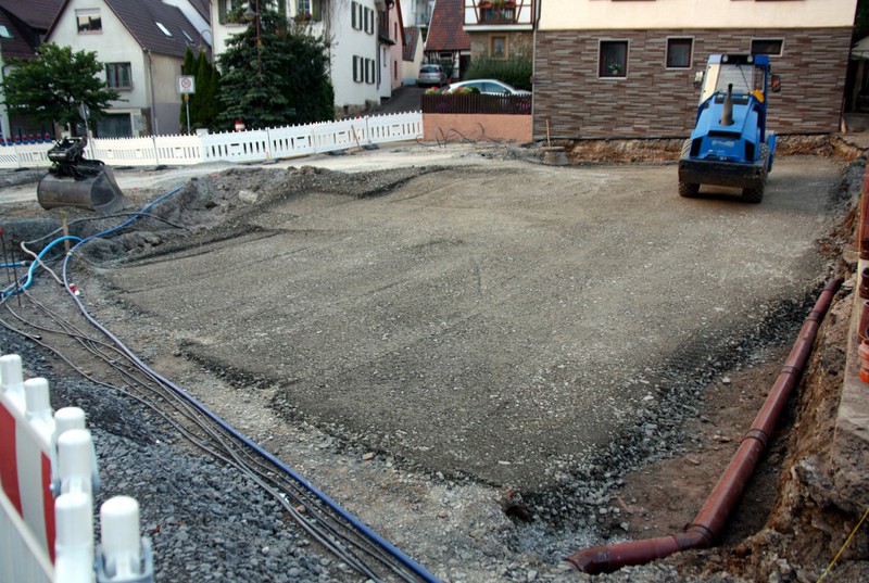 Die Kirbe ist rum und der plattgewalzte Vaux-le-Pénil-Platz erhält wieder Löcher. Es werden verschiedenen Schächte für das Oberflächenwasser verlegt. Der neue Gehweg hat den Schulberg erreicht. Noch mit kleinen Unterbrechungen kann man bald wieder vom Rand des Vaux-le-Pénil-Platz bis zum Schulberg laufen ohne die vielbefahrene Anwohner-Einbahnstraße nutzen zu müssen. Auf der Südseite arbeitet man weiter von zwei Seiten um hier die Leitungen im Untergrund zu verlegen. Es ist in den Bildern dieser Woche gut zu sehen wie viel Ordnung bei den Leitungstrassen im Untergrund vorhanden ist. Alle Bilder zeigen natürlich wie jede Woche ein reales Abbild der Baustelle…