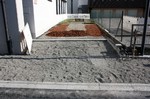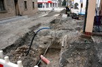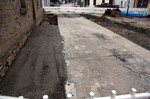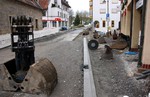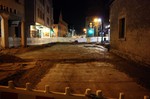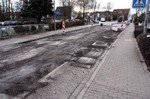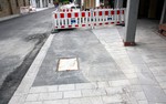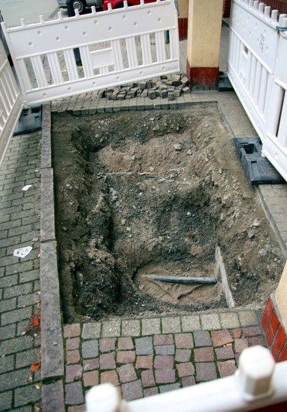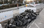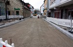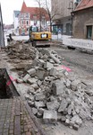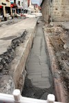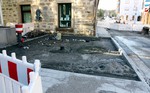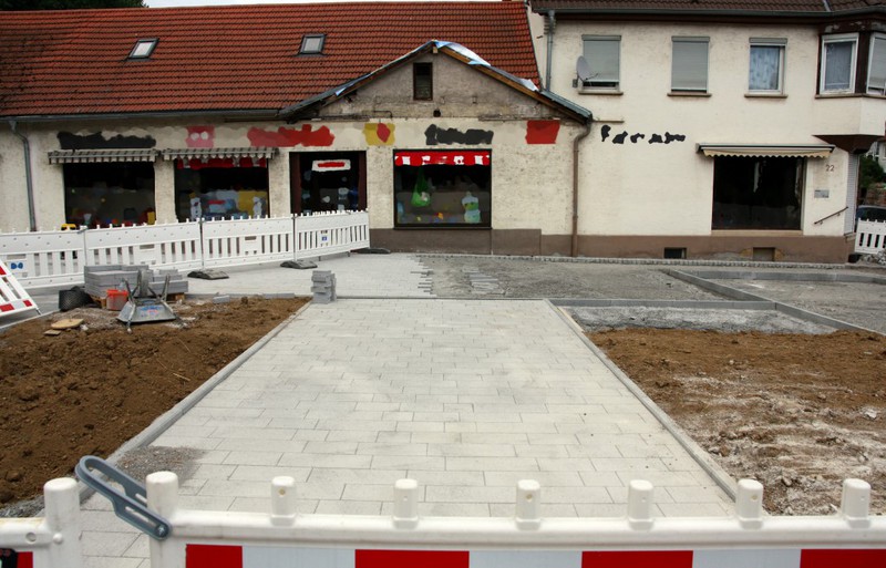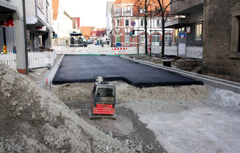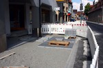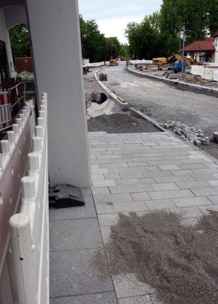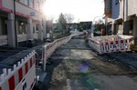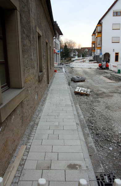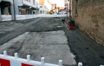 wurden ein paar Steine verlegt. Zuvor wurde der bisherige Gehweg entlang der Häuserreihe der nördlichen Straßenseite vollends ausgebaut und für die Pflasterarbeiten vorbereitet. Es liegt jetzt wohl