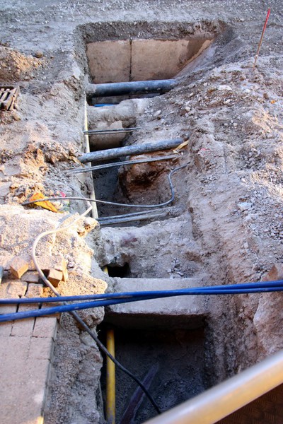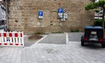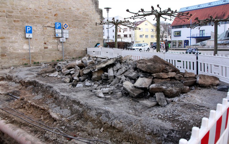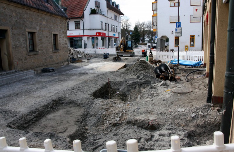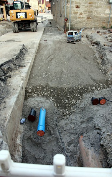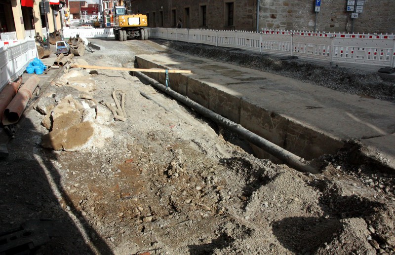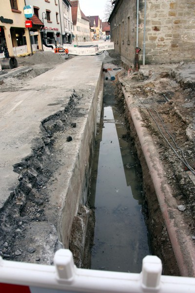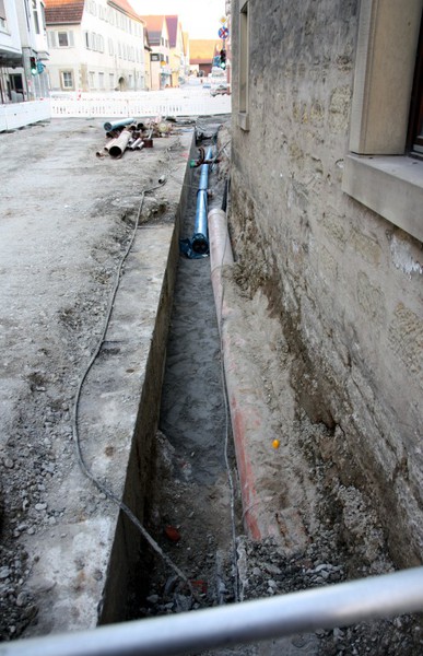 In dieser Woche kam man an den sehr engen Bereich zwischen dem Viereckkanal und der Zehntscheuer ran. So wurden hier die neuen Leitungen verlegt und die Baugräben bereits wieder geschlossen. Die Bilder konzentrieren sich genau auf diesen Fokus.