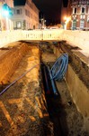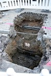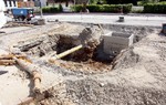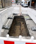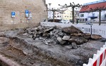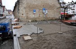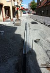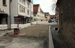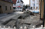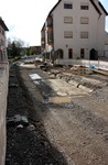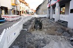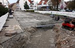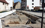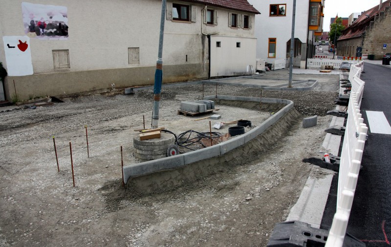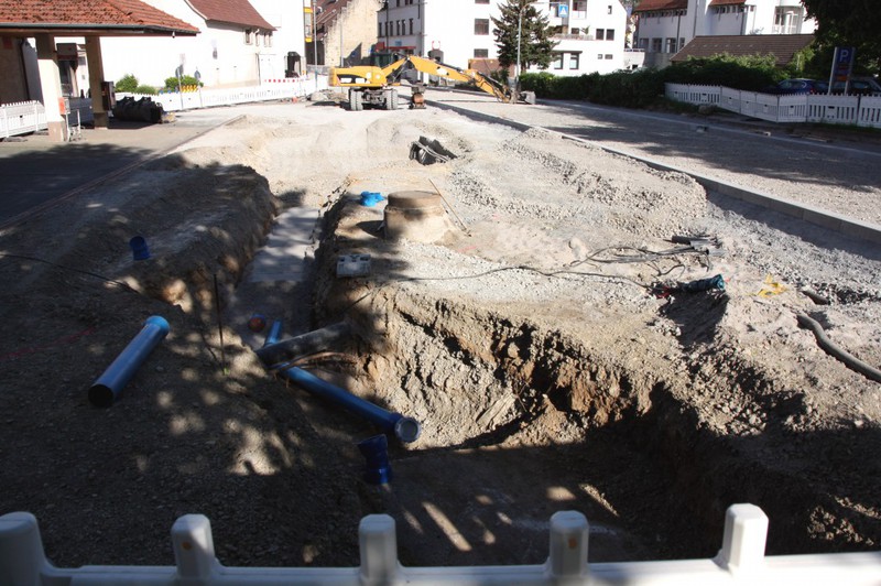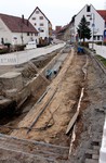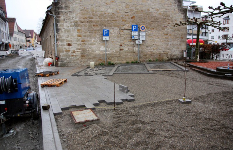 Der Wochenrückblick beginnt in dieser Woche ausnahmsweise am Mittwoch. Es wurde weiter fleißig der Graben für die neue Wasserleitung ausgehoben und im Abzweig Hirschstraße ein neuer Verteilerschacht angelegt. Die Pflasterarbeiten hinter der Zehntscheuer gingen auch voran, wobei diese von einer durch die Hauptbaufirma beauftragten Firma erledigt wurden. Nachdem im --> Bauabschnitt 1 der Vaux-le-Pénil-Platz so langsam zum Ende kommt, können dann die Pflasterleger in den Bauabschnitt 2 wechseln. Ein Teilstück des Gehwegs ist hier bereits entsprechend fürs Pflaster vorbereitet.