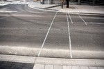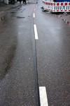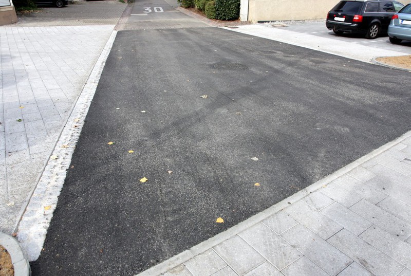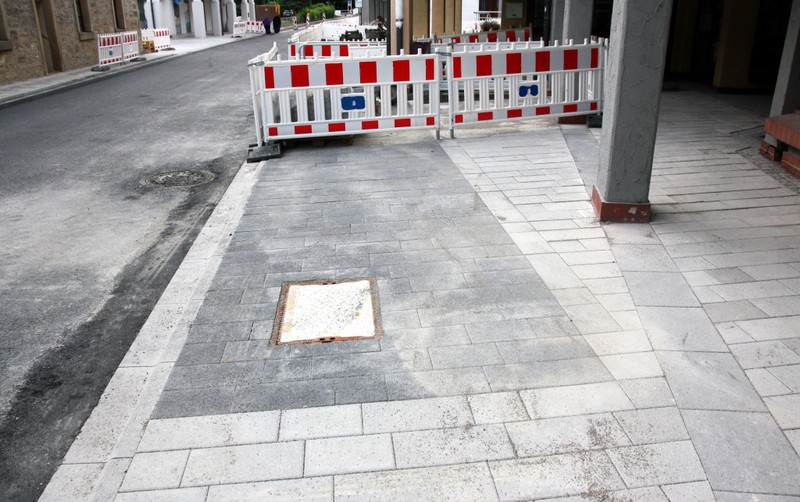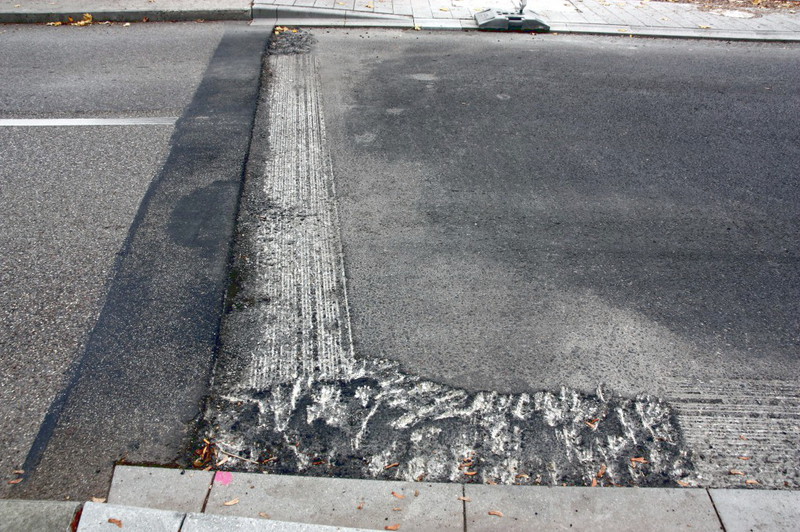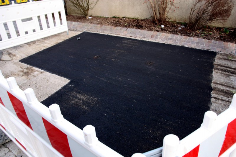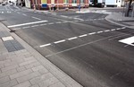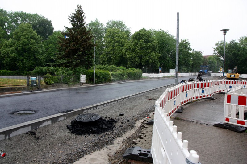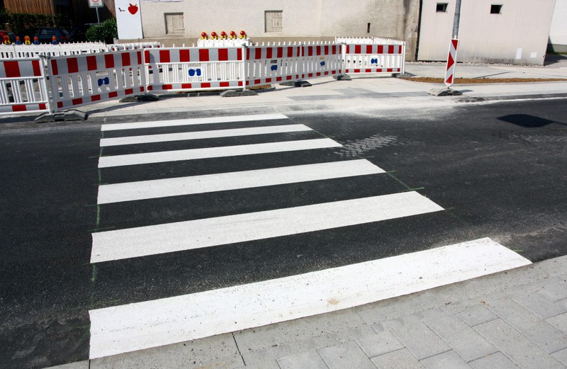 Nach der finalen Asphaltdeckschicht fehlten noch die Fahrbahnmarkierungen und Zebrastreifen. Zudem gab es an der ein oder anderen Stelle noch nachträglich Säulen, um