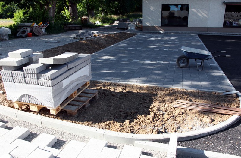zu pflasternden Flächen, welche nicht gerade rechteckig sind, und die rechteckigen Pflastersteine müssen eben aneinander angepasst werden.