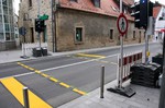 inkl. Markierungen auf der Fahrbahn aufgebaut. Sicherheit geht vor. Nachdem die ursprüngliche Ampelanlage wieder funktionierte, wurde die andre noch außer Funktion gesetzt und per Beschilderung deren