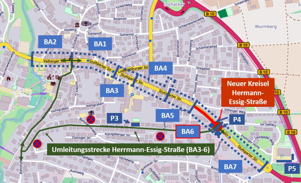 Vaux-le-Pénil-Platzes und der Bau eines neuen Kreisels an der Hermann-Essig-Straße. Die Baumaßnahme läuft in 7 Bauabschnitten von 07/2017 bis 07/2019. Es