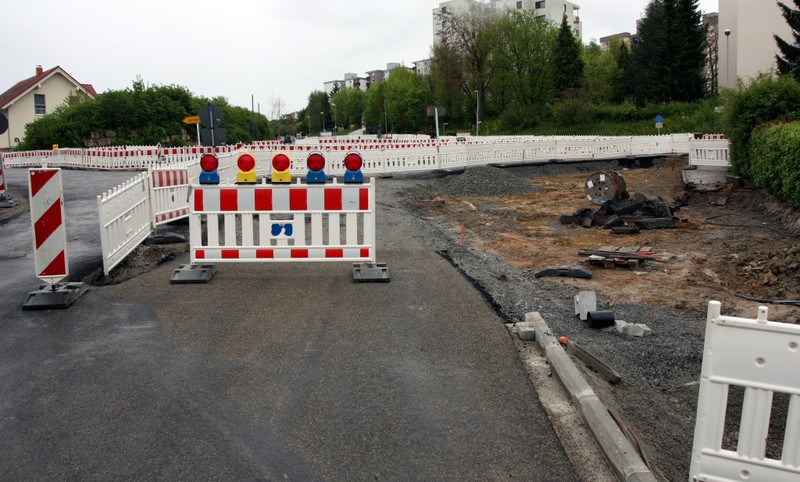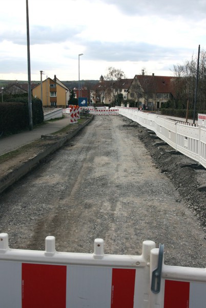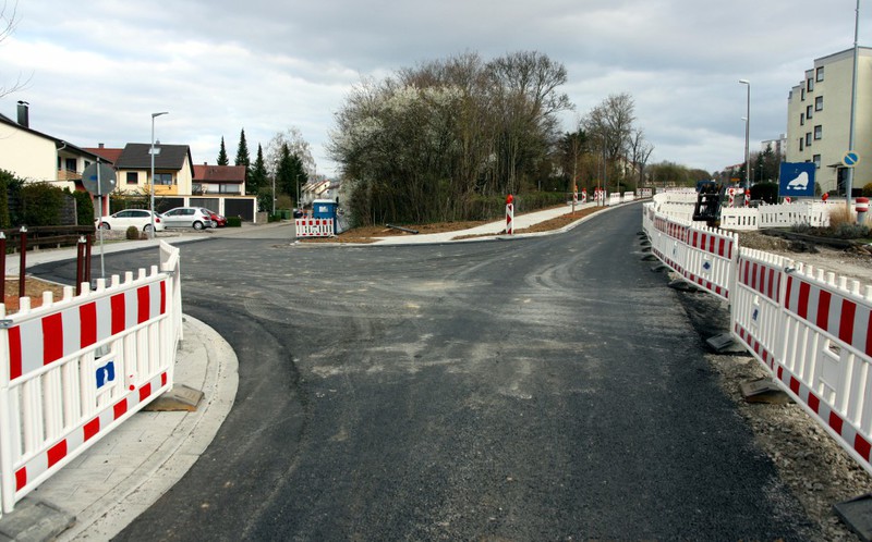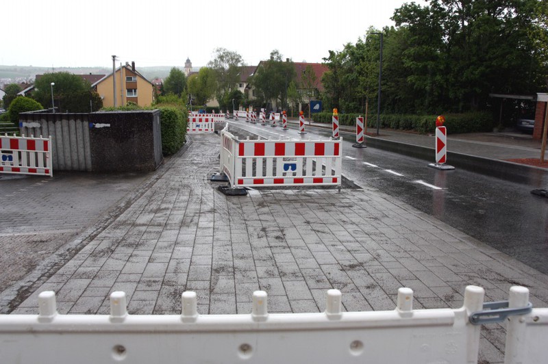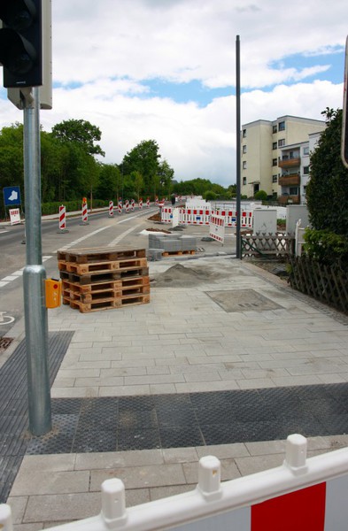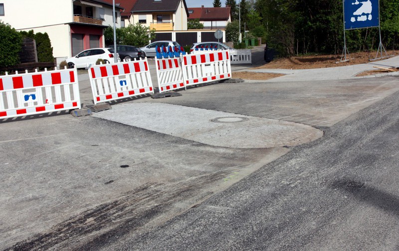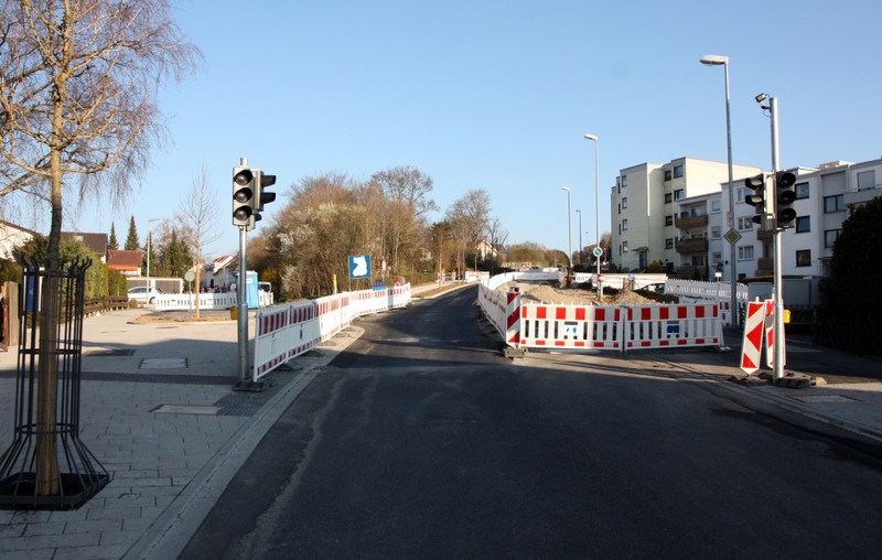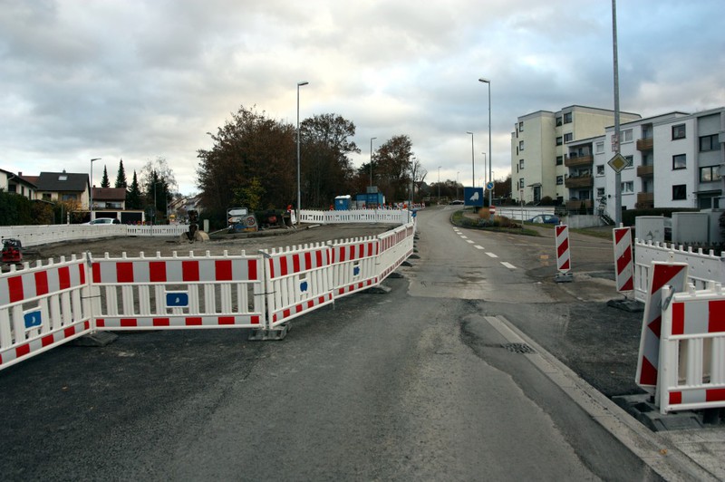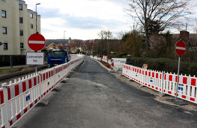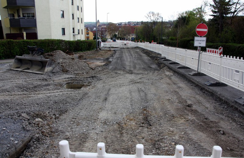ist die Durchfahrt der Busse und Anlieger (wirklich nur Anlieger) von West nach Ost. Die Herstellung des südlichen Gehwegs und der Bereich um den neuen Kreisel an der Hermann-Essig-Straße stehen noch