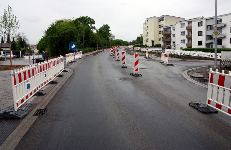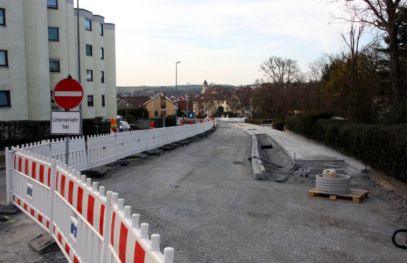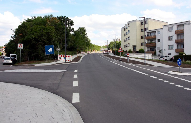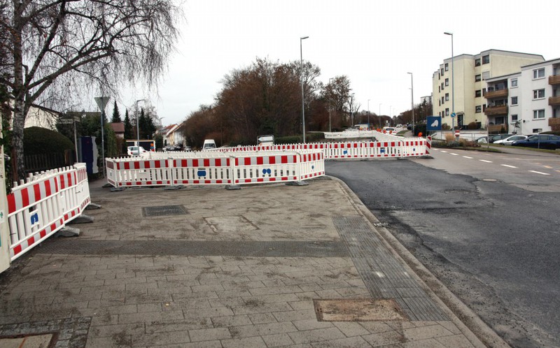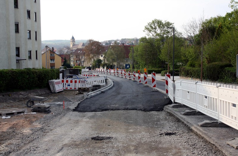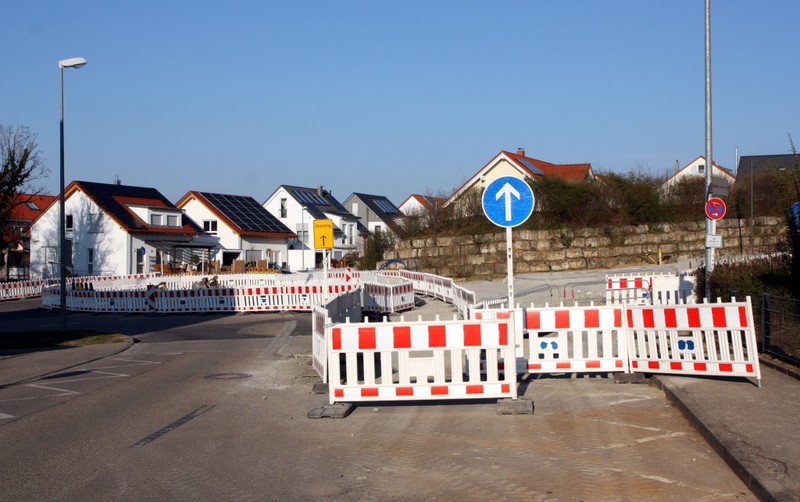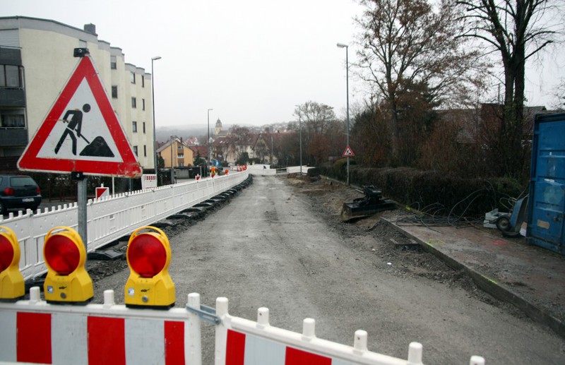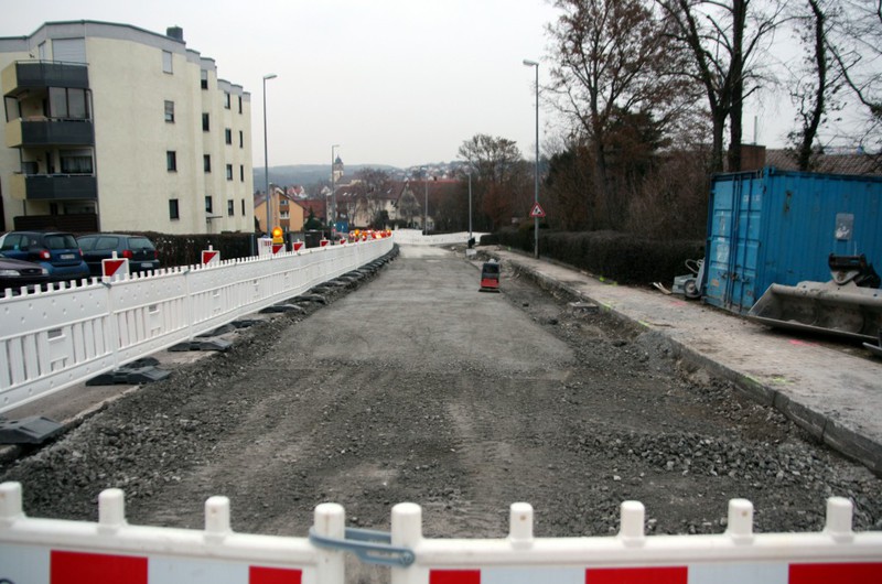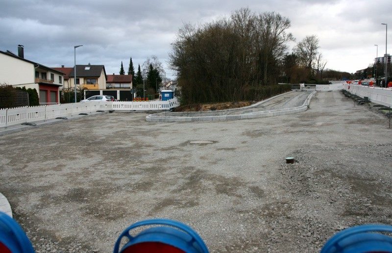 ist die Durchfahrt der Busse und Anlieger (wirklich nur Anlieger) von West nach Ost. Die Herstellung des südlichen Gehwegs und der Bereich um den neuen Kreisel an der Hermann-Essig-Straße stehen noch