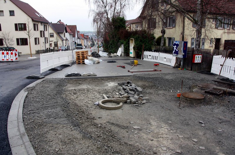 Etwas ungünstig ist es, dass es derzeit entlang der Stuttgarter Straße keinen Ersatzgehweg in Richtung des neuen Kreisels gibt. Genau hier sind noch die Pflasterarbeiten durchzuführen. Als Fußgänger