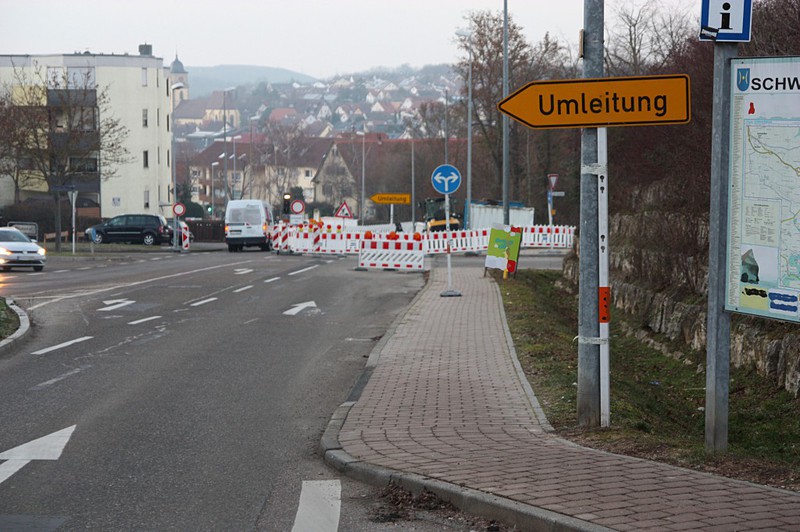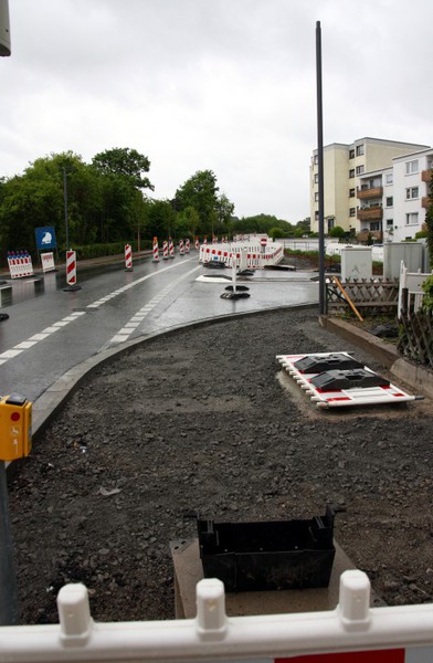angekündigt war, ist die Umleitungsstrecke temporäre nach Westen verlegt worden, um den künftigen Kreiselbereich für Tiefbauarbeiten zugänglich zu haben. Als Umleitungsfahrer musste man sich hier