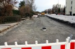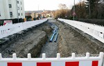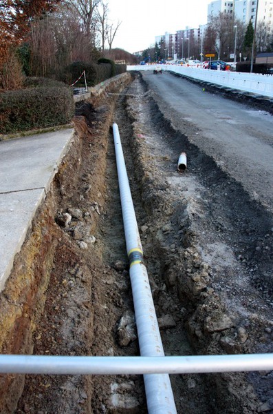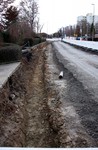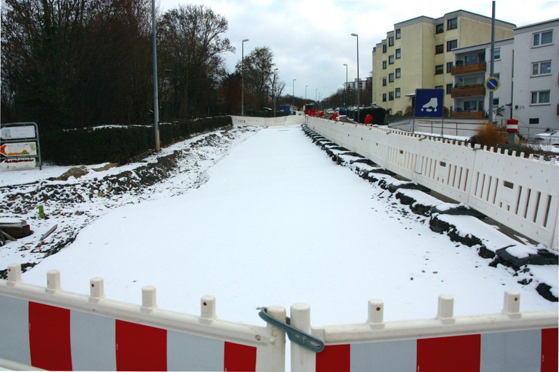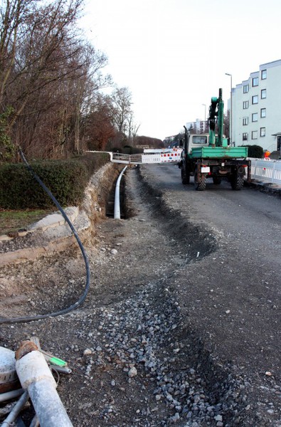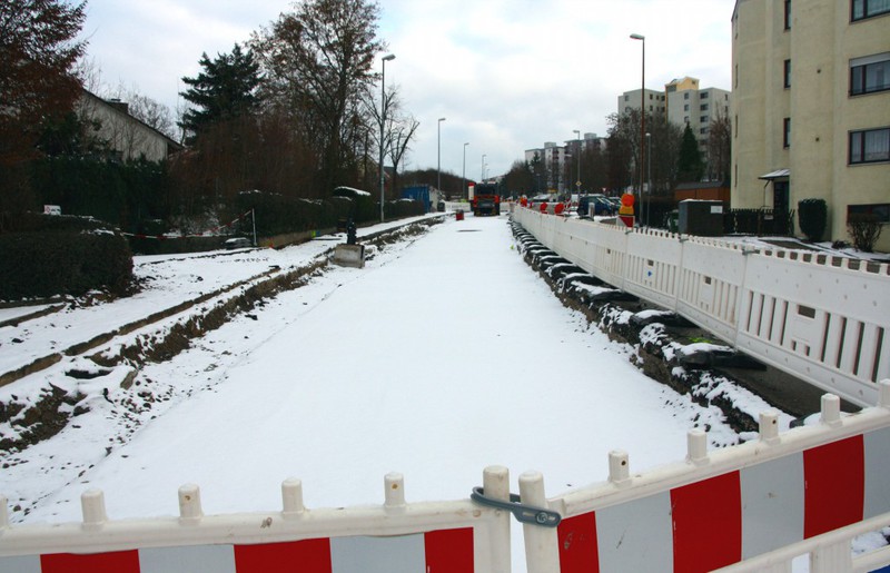Die Baustelle ist auf Höhe der Herrmann-Essig-Straße angekommen. Trotz winterlichen Bedingungen sind alle Leitungen verlegt und die Baugräben wieder verschlossen worden.