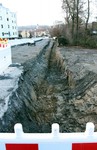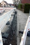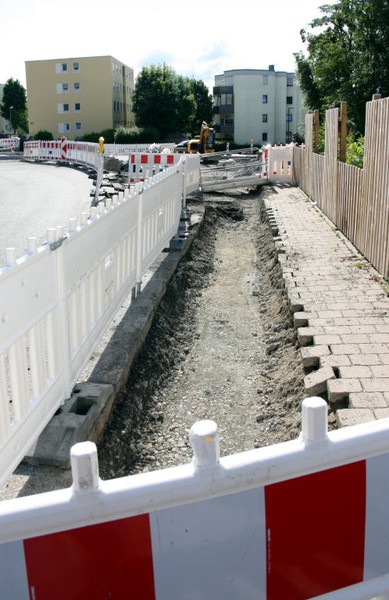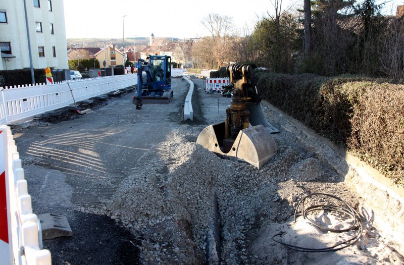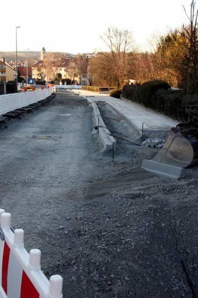 Im 6. Bauabschnitt geht es verhalten weiter. Seitlich wurde ein Graben ausgehoben. Dort werden wohl Leerrohre unterhalb des künftigen Gehwegpflasters verlegt. Im Bereich