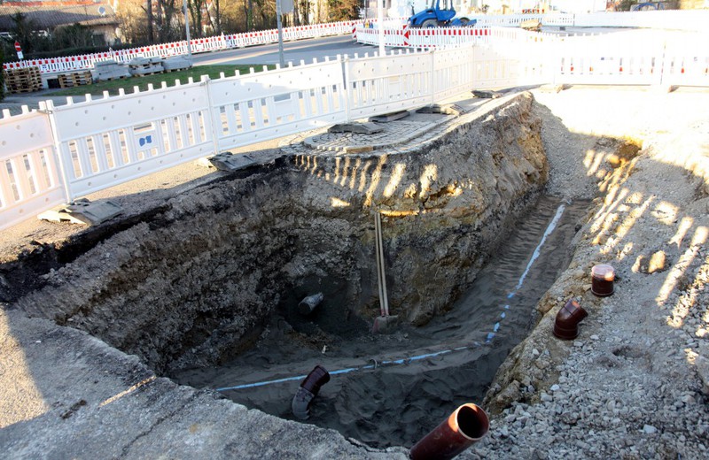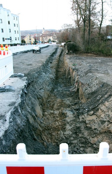 Nach dem Abkühlen des Asphalts kann dann der Verkehr verlegt werden und die Bauarbeiten rücken auf die südliche Seite der Stuttgarter Straße. In die Tiefe geht es hier