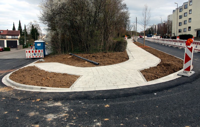 Die noch ausstehenden Abschnitte der Gehwege rechts und links des neuen Kreisels sind in dieser Woche mit Hochdruck fertiggestellt worden. Pünktlich zu den