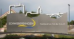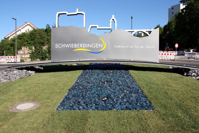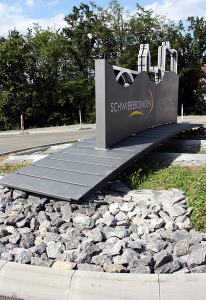 über die noch mit blauen Steinen anzudeutende Glems und das neue Schild mit dem modifizierten Schwieberdinger Logo und einer Schwieberdinger Silhouette sind bereits da. Zu der Silhouette gab es im