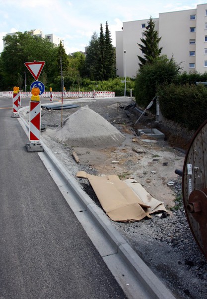 Neben den Arbeiten an den Gasleitungen gab es ebenso einen baulichen Fortschritt am unteren Ende des Bauabschnitts. An der Einfahrt zum Vöhinger Weg sind weitere Randsteine verlegt worden.