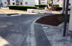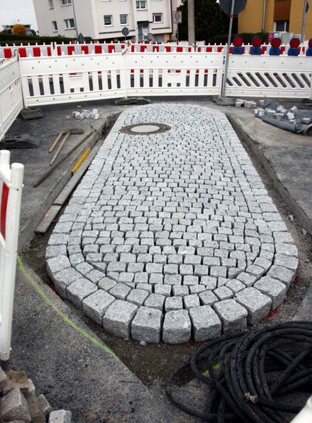 Am unteren Ende des Bauabschnitts waren wieder die Pflasterleger aktiv. Hier wurde der Abzweig des Vöhinger Wegs mit einer neuen Pflanzinsel versehen und die noch