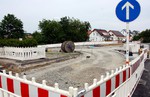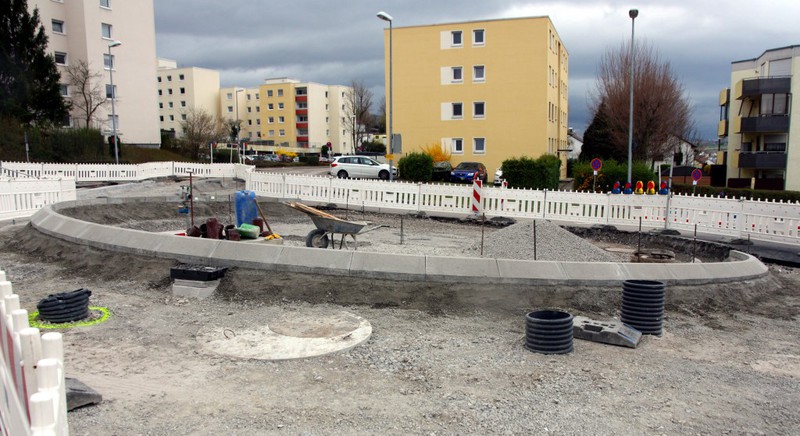 Zu guter Letzt nimmt der neue Kreisel an der Hermann-Essig-Straße Gestalt an. Hier ist das Rund der Randsteine angelegt und die Fundamente für die Aufbauten sind