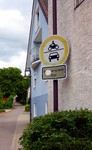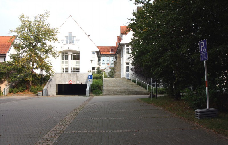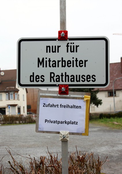 Fährt man aber an den Parkplatz hin, wird man durch ein Schild mit der Aufschrift "nur für Mitarbeiter des Rathauses – Zufahrt freihalten – Privatparkplatz"