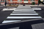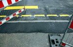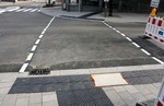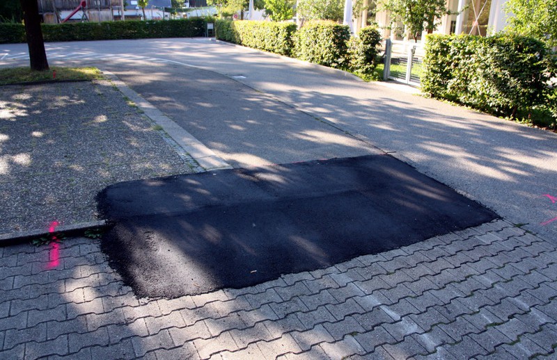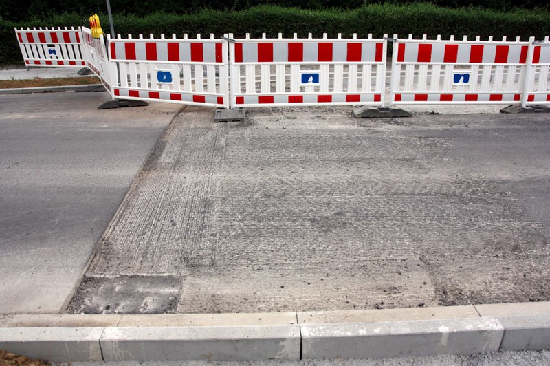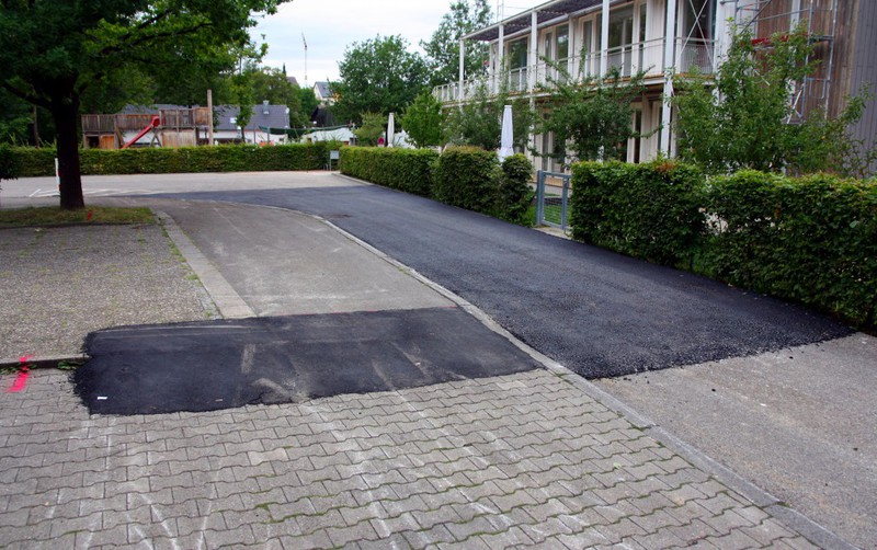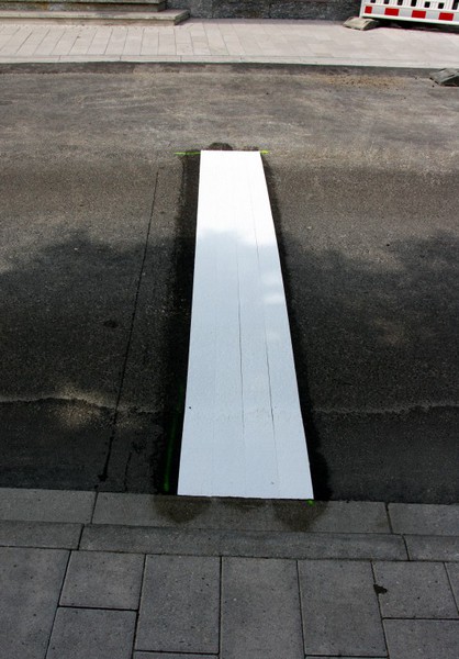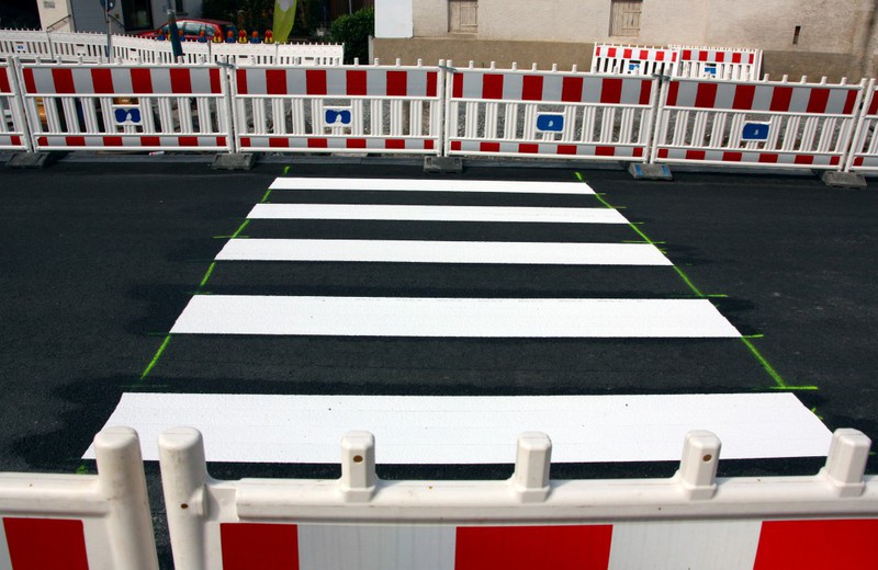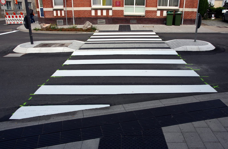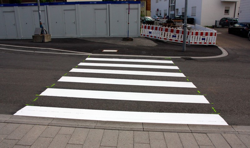 mehr Sicherheit für alle Fußgänger. Die Markierungen sind nur aufgeklebt, um sie vor der Aufbringung der finalen Asphaltschicht wieder entfernen zu können. Da die Markierungen in weiß ausgeführt