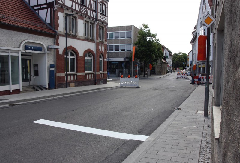 Die Asphaltarbeiten in der Bahnhofstraßenkreuzung sind abgeschlossen und diese ist wieder befahrbar. Die Beschilderung oben auf Höhe der Ludwigsburger Straße wurde von der Sackgassen-Beschilderung in
