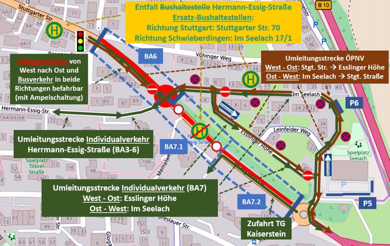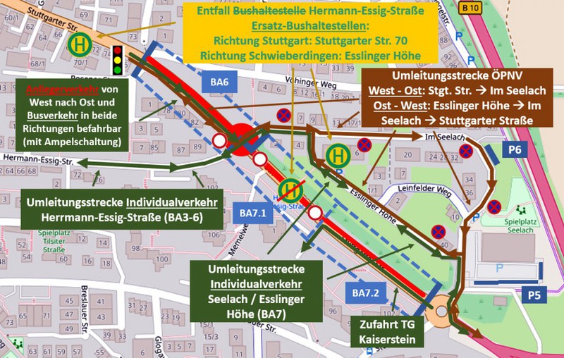 Busverkehr: Von West nach Ost: Stgt. Straße - Esslinger Höhe Von Ost nach West: Im Seelach - Stgt. Straße (Während Bauabschnitt 6 & 7) |