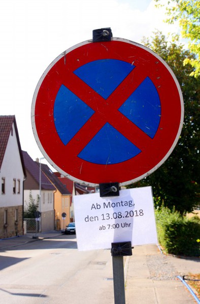 In dieser Woche wurden verschiedene Beschilderungen aufgestellt. Dazu gehören die Parkverbote in der Hermann-Essig-Straße, die überörtliche Umleitung über die B10 und ortseingangs die Hinweisschilder auf die Sanierung der Ortsdurchfahrt. Es sei angemerkt, dass auf den Hinweisschildern das Logo der ausführenden Baufirma fehlt.