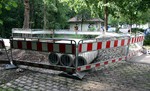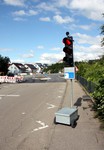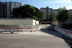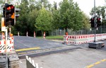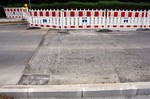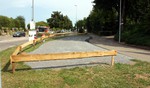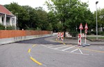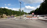 Die Rampen sind beinahe fertig. Es fehlen vermutlich noch Geländer an den Seiten. Ebenso sind die Schutzmaßnahmen am KiTa Herrenwiesenweg platziert worden. Dort entsteht durchaus ein Nadelöhr. Die Ausführung der Bodenbeläge wirkt sehr provisorisch. Werden die Asphalthügelchen die Belastung der Tausenden Fahrzeuge aushalten? Zudem stehen die Ampeln schon da und regeln den noch nicht vorhandenen Umleitungsverkehr.