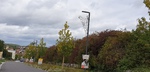 Diese führt zwischen Brief- und Verteilerkasten hindurch, über die gerade neu bepflanzte Grünfläche zum Fußgängerüberweg.