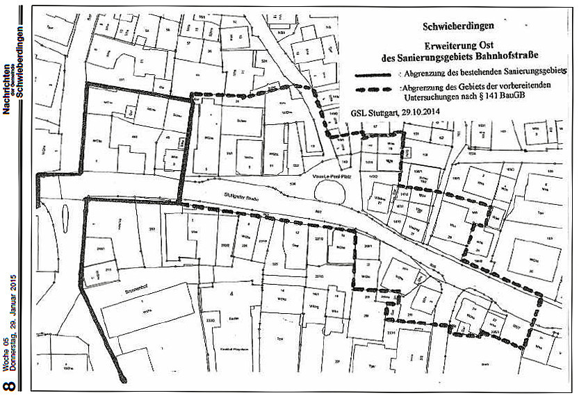 Die Bahnhofstraße ist seit 10 Jahren als Sanierungsgebiet ausgewiesen. Die Erweiterung in die Stuttgarter Straße bietet sich an, da hier die noch vorhandenen Fördergelder eingesetzt werden könnten. Die Gelder sollen in Schwieberdingen verbraucht werden. Um dies zu ermöglichen wurden die vorbereitenden Untersuchungen durchgeführt. Die Untersuchung ist notwendig, um die Verlängerung des Sanierungsprogramms beantragen zu können. Ein Antrag wird hierzu im September diesen Jahres beim Ministerium für Finanzen und Wirtschaft eingereicht (Der Laufweg geht über das Landratsamt Ludwigsburg, dem Regierungspräsidium Stuttgart hin zum Ministerium für Finanzen und Wirtschaft). Es ist das Ziel das Sanierungsprogramm bis zum 31.12.2017 zu verlängern. Derzeit endet das Programm am 31.12.2015.
