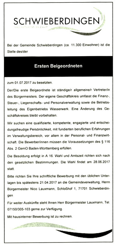 wurde wie beschlossen am 31. März 2017 im Staatsanzeiger für Baden-Württemberg ausgeschrieben. Bis zum Bewerbungsschluss am 21.04.2017 gingen zwei Bewerbungen ein.