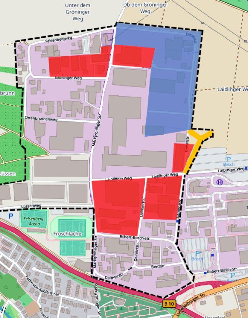Die gestrichelte schwarze Linie umgrenzt den Gültigkeitsbereich. Die roten Flächen stellen die Gebiete dar, in denen Vergnügungsstätten nicht mehr generell zugelassen werden sollen. Die blauen Markierungen stellen bereits überplante Bereiche dar, wo keine Vergnügungsstätten zulässig sind. In allen anderen Gebieten seien Vergnügungsstätten ebenso unzulässig. Die gelben Linien stellen eine bisher nicht realisierte Straße dar, welche den nach Norden verlegten Laiblinger Weg anbinden soll.