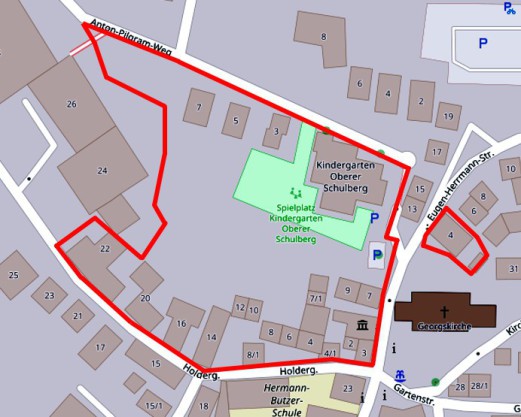 Bei der in 2014 im Gemeinderat getroffenen Entscheidung zur Verlegung des Kindergartens Oberer Schulberg an den neuen Standort beim Friedhof war bereits auf eine mögliche Nachnutzung des alten Areals und der Erstellung eines Bebauungsplans verwiesen worden. Die Aufstellung eines solchen Bebauungsplans wird nun angegangen. Die nachfolgende Karte zeigt grob den angedachten Geltungsbereich des Bebauungsplans. Zusätzlich soll das Gebiet in ein Landessanierungsprogramm aufgenommen werden, um Fördergelder zu erhalten. Ein entsprechender Antrag ist gestellt und eingereicht worden.