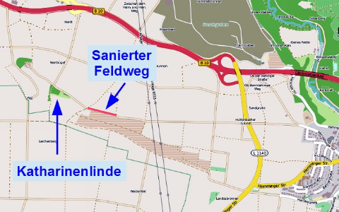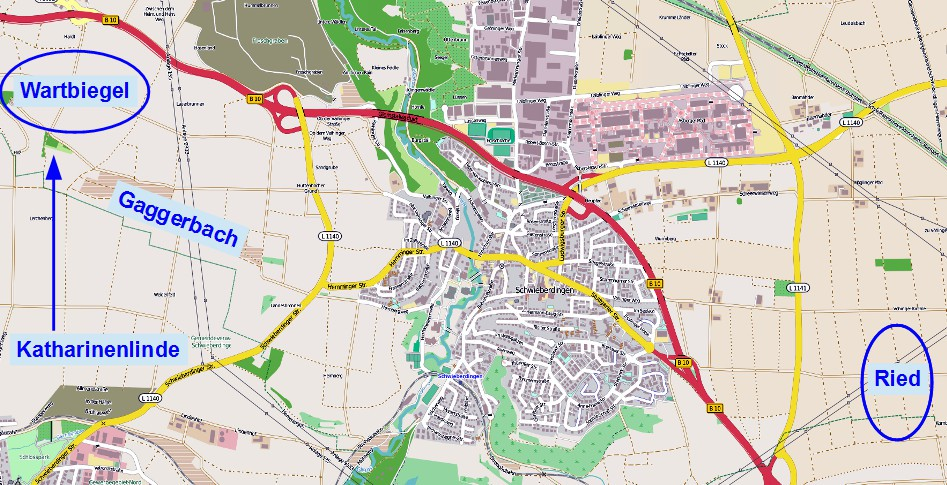 Es ist schon ein wenig verwirrend, wenn bei der Sitzung des AUT noch von einem Feldweg im Gewann Gaggerbach die Rede war, und kurz darauf wird aus dem Gewann Gaggerbach das Gewann Wartbiegel. Eines scheint sicher zu sein, es wird ein Feldweg in der Nähe der Katharinenlinde saniert werden. Ein wenig Überblick soll die folgende Karte aufzeigen. Mal schauen, welche Feldwege es nun wirklich werden...