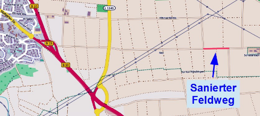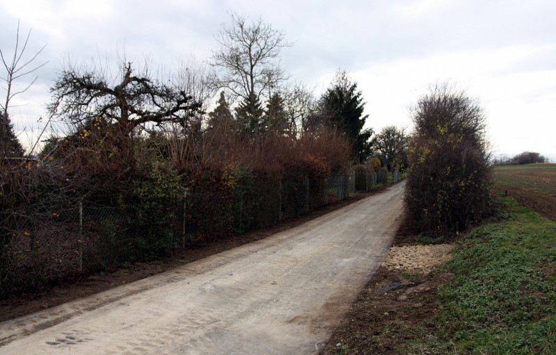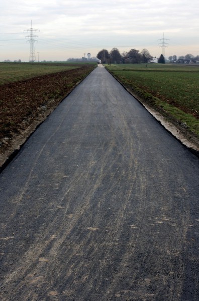 Die Feldwegsanierung ist an diesem Weg quasi beendet. Der Asphalt ist drauf und die Absperrung ist weg. Es werden wohl noch kleinere Angleichungen des neuen Feldwegs zu den angrenzenden Gartengrundstücken gemacht.