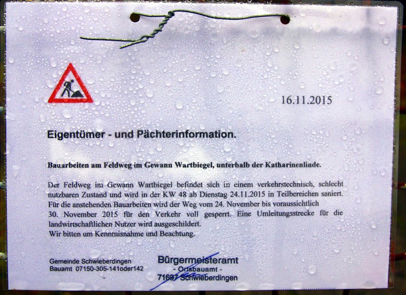Die Feldwege im Gewann Wartbiegel und Ried befinden sich in einem verkehrstechnisch schlecht nutzbaren Zustand und werden in der KW 48 ab Dienstag, 24.11.2015, in Teilbereichen saniert. Für die