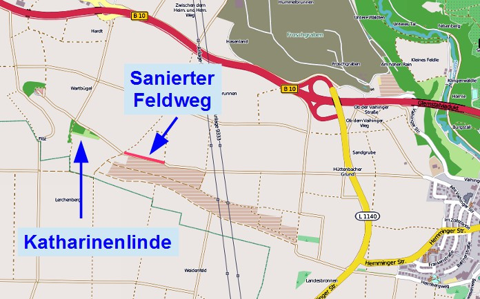 Eine Feldwegsuche hat sich nun erledigt. Im Gewann Gaggerbach / Wartbiegel wird nun ein Teilstück des direkten Wegs in Richtung Katharinenlinde saniert. Die Karte zeigt die genaue Stelle des Weges oberhalb der Gartengrundstücke. Der zweite Feldweg im Gewann Ried wird alsbald möglich nachgereicht.
