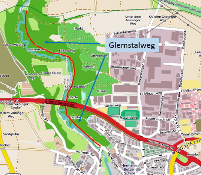 Saniert werden soll der rechtsseitige Weg neben der Glems von der Ortsgrenze am Talweg/Holdergasse bis zur Gemarkungsgrenze zu Markgröningen (dort wo der Weg vom Glemstal hoch zum Gebiet "Markt" losgeht). Der Weg ist im obigen Plan rot markiert (und die B10 gehört hier nicht dazu...).