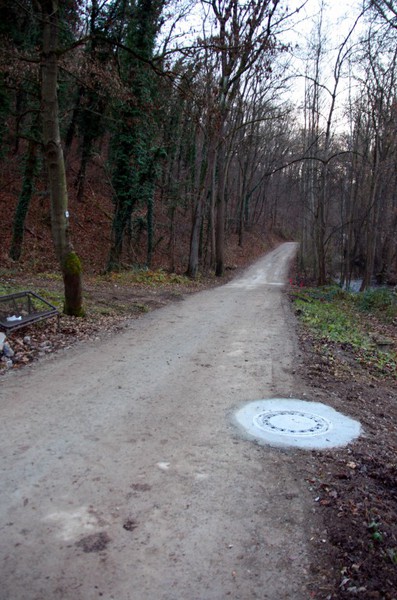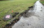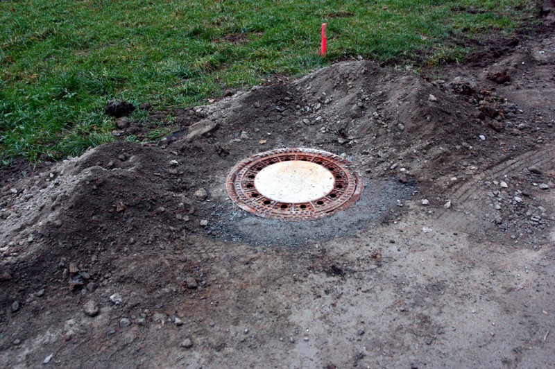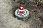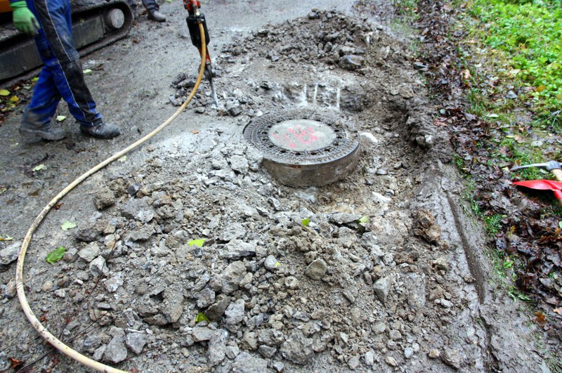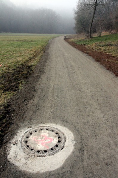 Die Schachtdeckel werden wieder auf die richtige Höhe gesetzt. Es gibt sehr viele Schachtdeckel im Glemstal. Diese gehören zu den Leitungen zum Klärwerk Talhausen.