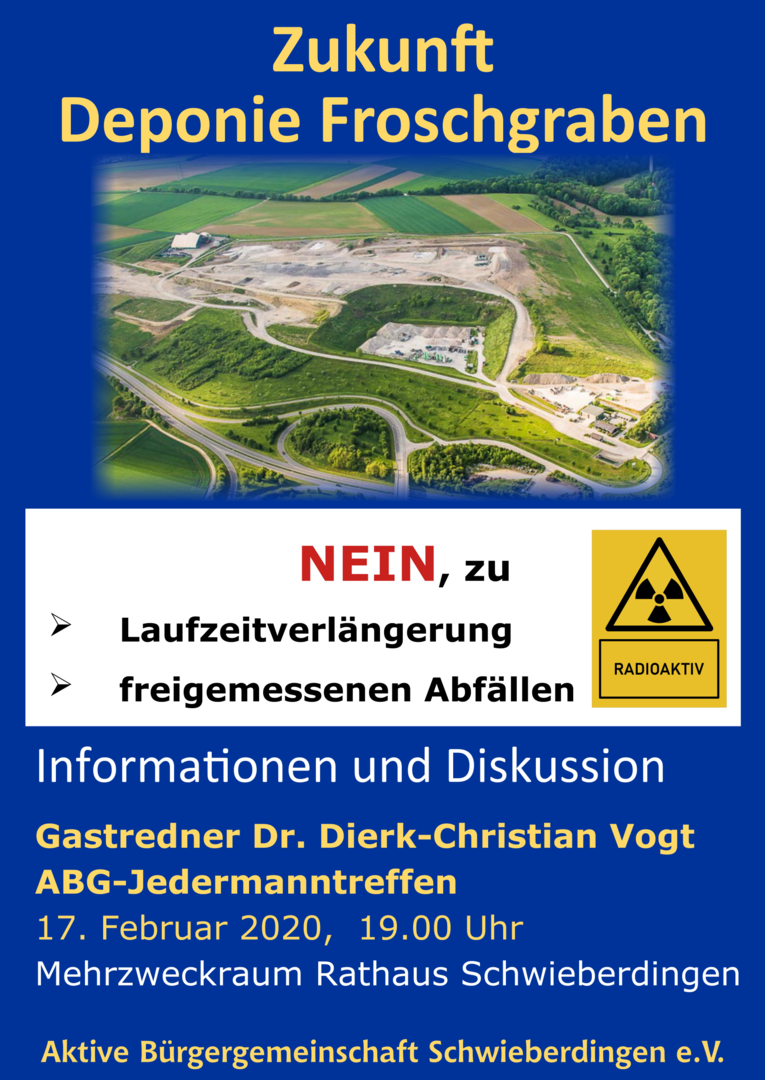 Am Montag dem 17.02.2020 hat die ABG e.V. zur „Zukunft der Deponie Froschgraben“ in den Mehrzweckraum geladen. Der Einladung sind zahlreiche Gäste gefolgt und erlebten einen interessanten Abend mit einem Vortrag von Herrn Dr. Dierk Vogt.