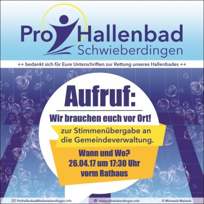 Lesen Sie unseren Bericht in den Schwieberdinger Nachrichten Nr. 23/2016 über den aktuellen Stand beim Schwieberdinger Hallenbad. Es steht immer noch unverändert an seinem Platz. Deshalb braucht es ein wenig Aufmerksamkeit...