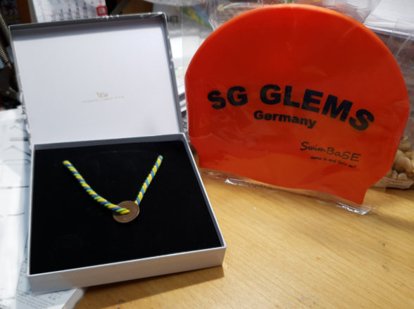 Dieses Jahr war das Geschenk eine persönliche Erinnerung an das Schwieberdinger Hallenbad und deren Schwimmer, eine Badekappe und eine Eintrittsmünze mit Kette.